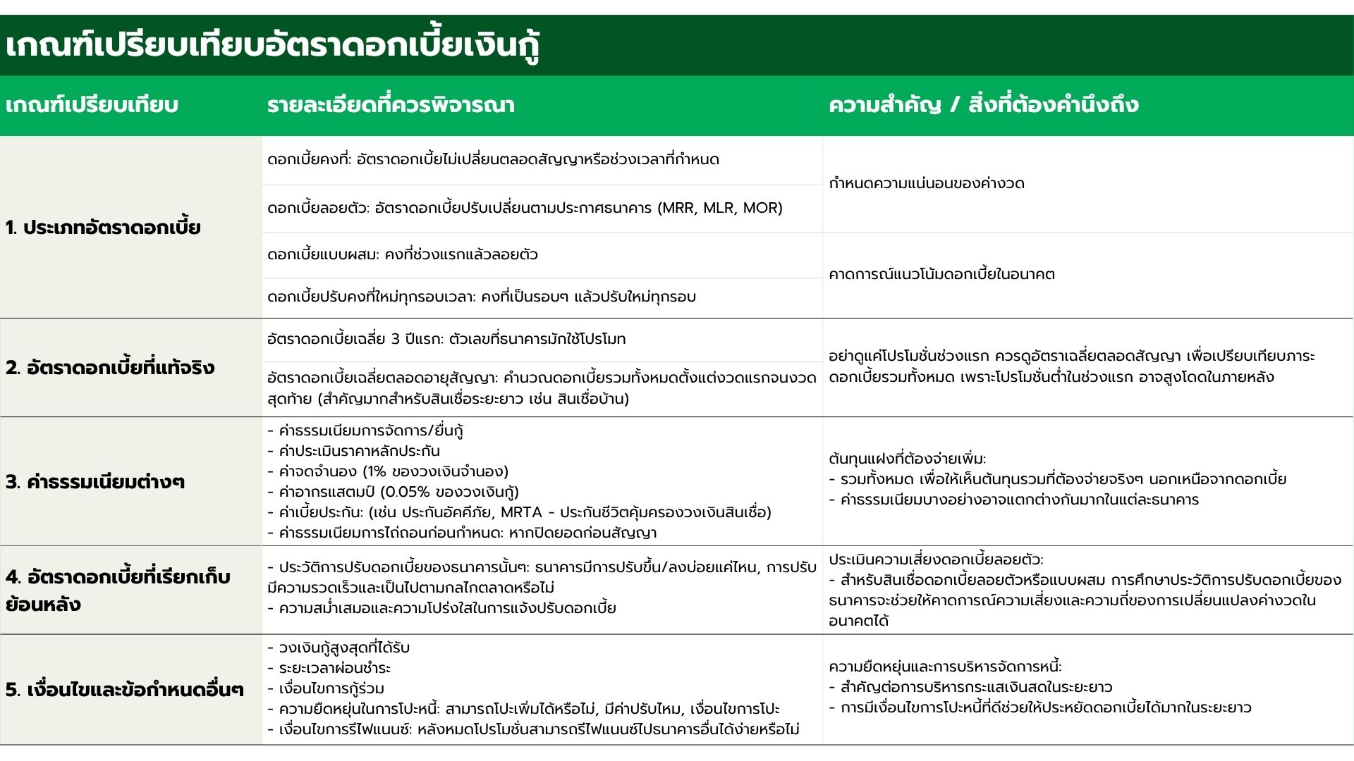 สินเชื่อบ้านแต่ละประเภท จะมีวงเงินกู้สูงสุด ระยะเวลาผ่อนชำระสูงสุด และอัตราดอกเบี้ย ที่ไม่เท่ากัน โครงการสินเชื่อแต่ละโครงการจะมีลักษณะที่โดดเด่นแตกต่างกัน เช่น เงื่อนไข โปรโมชั่น วิธีคิดอัตราดอกเบี้ย การลดหย่อนค่าธรรมเนียมบางประการ เป็นต้น ซึ่งคุณสามารถนำแต่ละโครงการมาเปรียบเทียบความคุ้มค่าได้เพราะฉะนั้น จำเป็นอย่างยิ่งที่ผู้สนใจกู้จะต้องศึกษาเงื่อนไขให้ครบถ้วนก่อนตัดสินใจกู้